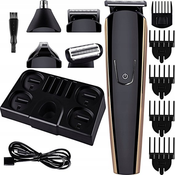 Maszynka do strzyżenia włosów i brody z kompletnym zestawem akcesoriów to praktyczne urządzenie do użytku domowego i profesjonalnego. Dzięki wymiennym nasadkom pozwala na precyzyjne strzyżenie włosów, brody, wąsów oraz usuwanie owłosienia z nosa i uszu. Ostrza wykonane ze stali nierdzewnej zapewniają trwałość i wysoką jakość cięcia, a wbudowany akumulator umożliwia wygodną pracę bez kabla. Kompaktowy rozmiar oraz stojak na akcesoria sprawiają, że maszynka jest poręczna i łatwa w przechowywaniu.