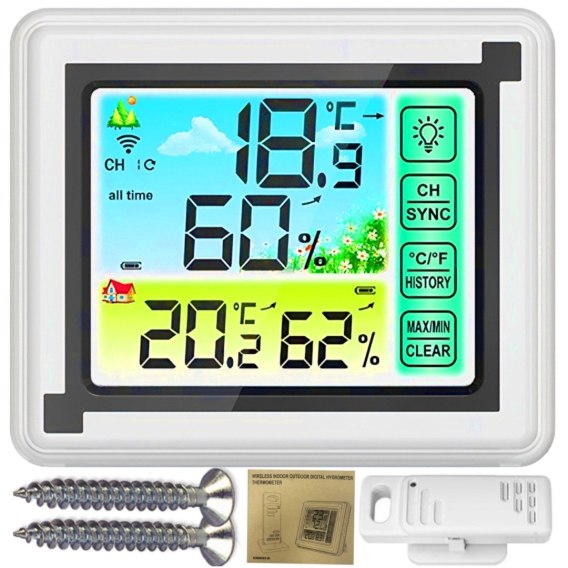 Stacja pogodowa z dużym wyświetlaczem LCD, umożliwiająca codzienny pomiar temperatury i wilgotności w pomieszczeniach oraz na zewnątrz. Urządzenie wykonane z białego tworzywa sztucznego, może być ustawione na stoliku, półce lub powieszone na ścianie. Obsługuje kilka czujników, co pozwala monitorować warunki w różnych pomieszczeniach jednocześnie.