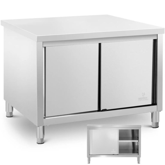 Stół roboczy z szafką Royal Catering to must-have każdej profesjonalnie wyposażonej kuchni, która spełnia wysokie wymagania branży gastronomicznej. Sprawdzi się w restauracji, stołówce, hotelu, piekarni, szpitalu czy kuchni komercyjnej. Mebel stoi na nóżkach o wysokości 15 cm, które można regulować w zakresie do 20 mm. Dzięki temu uzyskasz odpowiednią stabilność na nierównej podłodze. Powierzchnia robocza szafki ze stali nierdzewnej o wymiarach 120 x 80 cm zapewnia miejsce na codzienną pracę ze świeżą żywnością, składnikami i sprzętem kuchennym. Przemyślane połączenie blatu roboczego ze wzmocnioną płytą MDF i szafki do przechowywania zapewni szerokie zastosowanie i z łatwość w utrzymaniu porządku w kuchni. Dzięki cicho otwieranym drzwiom przesuwnym przybory kuchenne bezpiecznie i schludnie schowasz w środku. Zastosowanie przesuwnych drzwi sprawia, że szafka robocza idealnie nada się do mniejszych kuchni. Wnętrze przedzielone jest solidną półką, która zapewni porządek wewnątrz. Całkowite obciążenie stołu gastronomicznego wynosi 500 kg. Z czego 300 kg przypada na wzmocniony blat, podczas gdy dolne półki zniosą obciążenie po 100 kg. Wykonany z wysokiej jakości stali nierdzewnej stół roboczy z szafką zachwyca dużą wytrzymałością, gwarantuje długą żywotność oraz jest odporna na korozję i uszkodzenia mechaniczne (np. zadrapania). Łatwy w pielęgnacji materiał bez problemu wyczyścisz. Dzięki temu mebel spełni wymogi higienicznej pracy z żywnością.