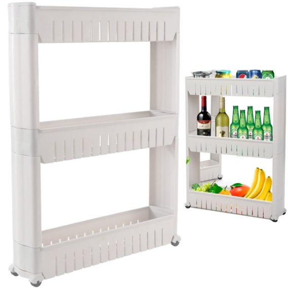 Mobilny, uniwersalny regał nadający się do kuchni, łazienki, sypialni czy salonu. Funkcjonalny mebel pozwalający maksymalnie wykorzystać niezagospodarowaną przestrzeń i ułatwiający utrzymanie porządku oraz przechowywanie różnorodnych akcesoriów. Regał posiada trzy półki i cztery kółka, dzięki którym łatwo go przemieszczać i ustawić w dogodnym miejscu. Wykonany z wysokiej jakości tworzywa sztucznego, odporny na obciążenie, temperaturę i promienie UV, montaż możliwy bez użycia narzędzi w 9 prostych krokach.