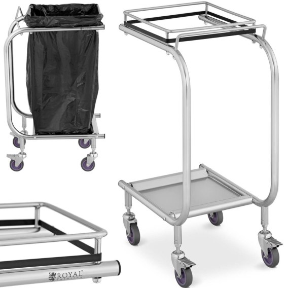 Stojak na worki do śmieci marki Royal Catering sprawdzi się w hotelach, pensjonatach czy w placówkach opiekuńczych. Wystarczy zamontować worek w ramie, dzięki czemu jest on szeroko otwarty. Stojak wykonany został ze stali nierdzewnej i tworzywa sztucznego. Cztery kółka obrotowe, w tym dwa z hamulcami pozwalają na manewrowanie nawet w wąskich korytarzach.