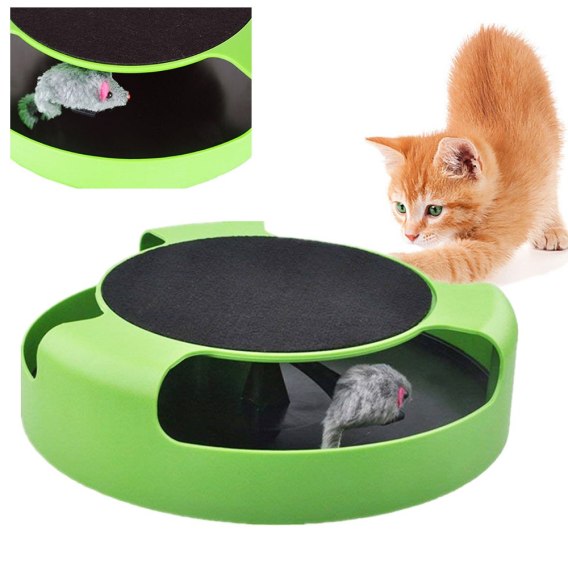 Zabawka ma dwie funkcje, które zajmą naszego kota na dłuższy czas. Pierwsza to pędząca w kółko myszka, która po uderzeniu łapką wprawiana jest w ruch a druga to okrągły drapak dla naszego pupila.
