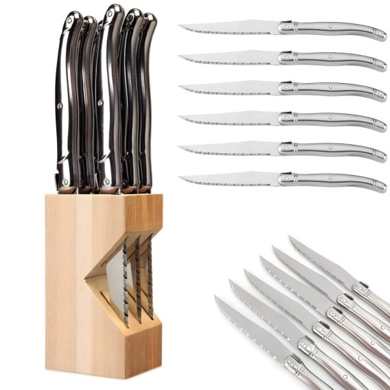 Zestaw noży do steków to praktyczne i eleganckie narzędzie, które sprawdzi się zarówno w kuchni domowej, jak i profesjonalnej. Noże wykonane są z wysokiej jakości stali nierdzewnej i umieszczone w drewnianym bloku, co zapewnia wygodę przechowywania oraz dbałość o ich trwałość. Dzięki ergonomicznym uchwytom i ząbkowanym ostrzom precyzyjnie kroją mięso, zachowując jego soczystość i strukturę. Srebrny kolor oraz elegancki design sprawiają, że zestaw będzie również ozdobą kuchni.
